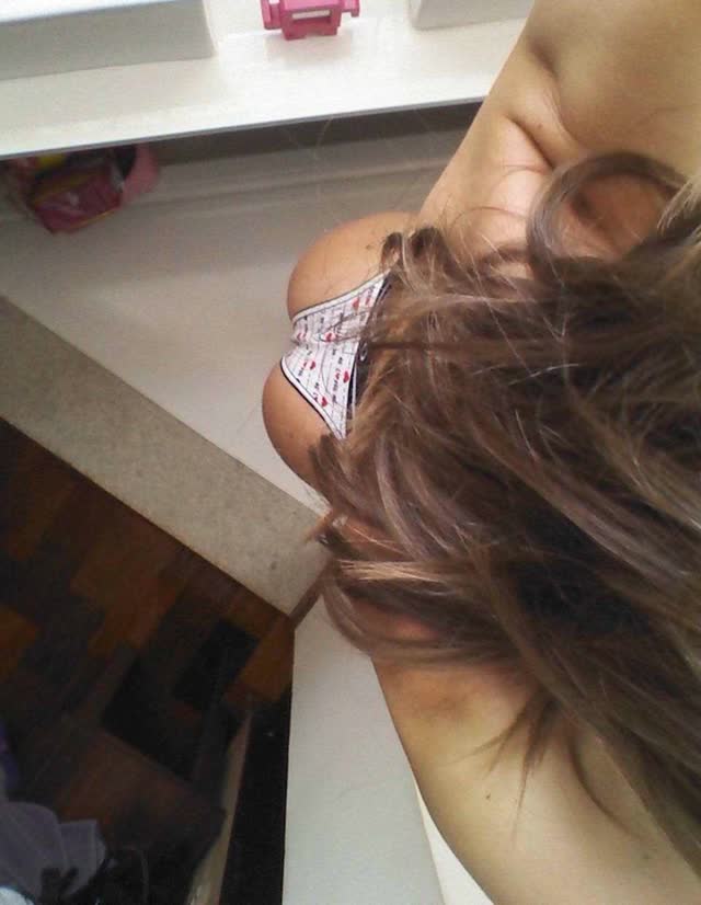 Branquinha novinha ficando pelada,tesuda e safada ao extremo, mostra suas lingeries e depois tira a calcinha e mostra sua buceta carnuda e rosada e os peitões super aconchegantes.